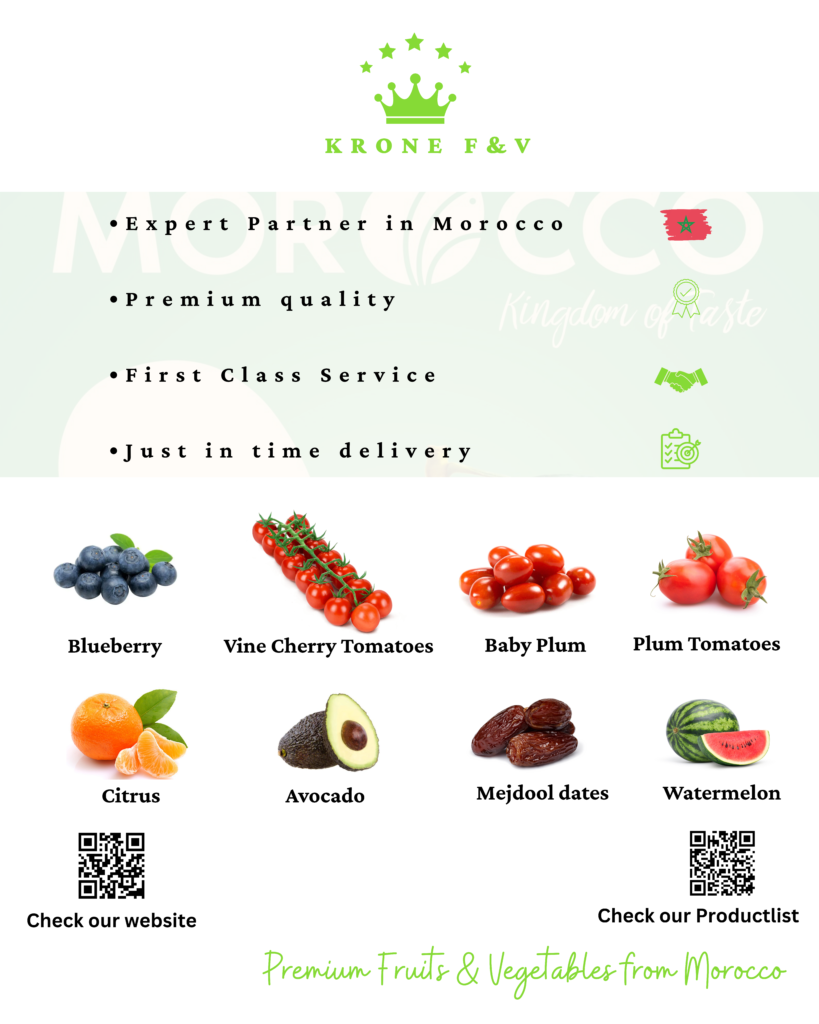 KRONE F&V exports premium Moroccan fruits and vegetables, with operations in Agadir and Gharb. The company cultivates its own tomatoes and partners with trusted growers to ensure consistent quality, freshness, and reliability. All products meet strict international food safety standards, with careful attention from cultivation to transport to deliver excellence worldwide.